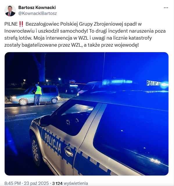 „PILNE! Bezzałogowiec Polskiej Grupy Zbrojeniowej spadł w Inowrocławiu i uszkodził samochody! To drugi incydent naruszenia poza strefą lotów. Moja interwencja w WZL i uwagi na liczne katastrofy zostały bagatelizowane przez WZL, a także przez wojewodę!”